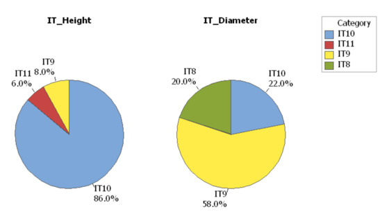 The results show that the International Tolerance Grade of the height dimension was IT10 for 86% of specimens (Figure 16). A significant variation in the IT Grade percent was detected for the diameter dimension with a 58% IT10 distribution, as shown in Figure 16. The IT Grade, which represents the dimensional accuracy of the AM systems for each interval of ISO basic sizes can be determined using the same procedure.