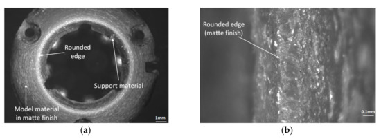 The quality of the lower and upper edges of the circular artifact may influence the artifact height dimension. A good quality surface without material defects was detected on the upper edge of the specimen (Figure 18b). The edges of the upper surface printed in glossy mode were rounded, as shown in Figure 18b. Additionally, the sharp edge of the lower surface affected by the support material was rounded, as shown in Figure 17. This edge roundness can explain why the distribution of the height measurements was located near the lower tolerance limits and was lower than the nominal value.