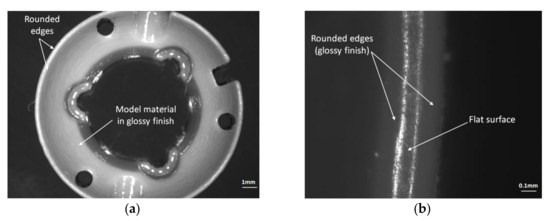 A microscopy analysis study was performed to conduct a quality inspection of the critical features of the circular workpiece. The dimension H was measured between the upper and lower surface of the specimen, and dimension D on the upper surface of the workpiece, respectively. The quality of these surfaces should be investigated. There was no support material deposited on the upper surfaces of the model printed in glossy mode, only on the bottom surfaces, as shown in Figure 17 and Figure 18.