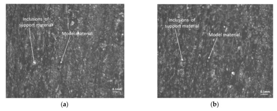 For both the glossy and matte finishes, microscopic investigations on the lateral surface of the circular artifact were conducted on a perpendicular and parallel direction to the X-axis (Figure 19 and Figure 20). It can be seen as a clean and smooth surface in the X-axis direction (Figure 19a) for a glossy finish. Rough areas were detected on the perpendicular direction to the X-axis (Figure 19b). The steep surface affected by the support material indicates a homogenous material that contained small inclusions of the FullCure 705 support material (Figure 20).