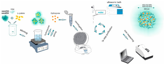 - The process of serum albumin-derived nanoparticles, loading with hydroxyurea (HU) through the adsorption, consisted of the synthesis of the drug-free nanoparticles (Section 2.2) and their subsequent loading with the drug. For this aim, the hydroxyurea was added to 22 mL of the nanoparticles’ aqueous suspension (HU concentration was either 2, or 4, or 6 mg/mL) in an amount of either 45 or 90, or 135 mg. The resulting suspensions were stirred at a constant rate of 200 rpm for 2 h. The final stage was the centrifugation of the suspensions in three cycles at 14,000 rpm to remove the unbound HU.