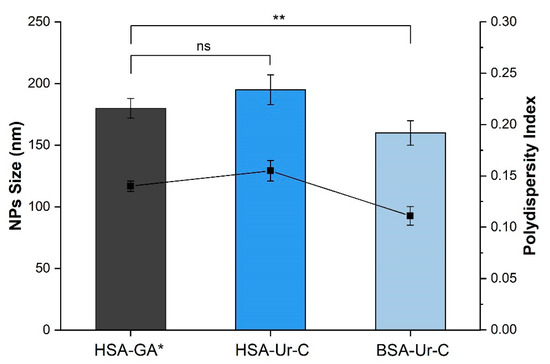 Effects of the type of serum albumin and cross-linking agent on the size and polydispersity index of NPs (the size values are depicted as columns, and the polydispersity index is shown as the solid line). * Albumin nanoparticles with glutaraldehyde (HSA-GA) were prepared according to the procedure described in [34]. Data are presented as mean ± SD (n = 3), ** p < 0.001; ns = no significant.
