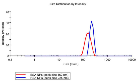 There was some difference in the size of NPs derived from HSA and BSA encapsulation. For both systems, a size distribution profile is monomodal (Figure 4) with the PI values for NPs based on BSA and HSA being 0.242 and 0.284, respectively. This parameter is a problem in obtaining nanoparticles because the size influences the biological and chemical properties of NPs [39,40]. Analogously to the case of HU loading in NPs with the absorption method (Table 1), upon using the inclusion approach the loading efficiency was higher for the BSA-derived particles (78%) in comparison to the HSA-derived drug carrier (69%) (Table 2).