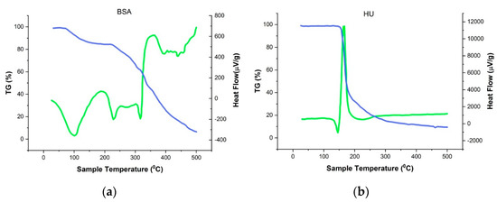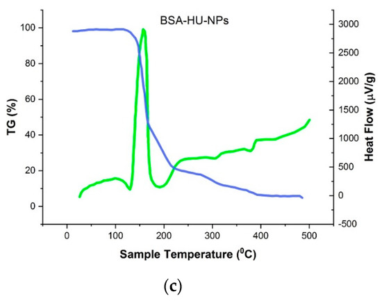 Thermogravimetric (blue) and differential scanning calorimetry (green). (a) BSA; (b) HU; (c) BSA-HU-NPs.