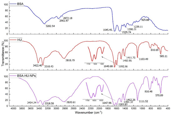 FTIR spectra of pure BSA and immobilized HU nanoparticles were obtained (Figure 7). The presented spectra consist of the bands of original albumin detected at 3284 cm−1 (A—amide, linked to N-H), the next pointed peak at 2960 cm−1 (B—amide, bound to free ion), amide II recorded peak at 1535 cm−1 related to C-N stretching and N-H bending movements; the amide I peak at 1642 cm−1 corresponds to the C-O bond; detected CH2 groups are located at 1393 cm−1, and the amide III at ~1245 cm−1 linked to the C-N group stretching and N-H bending. The main area for the study of protein secondary structure is amide I [44]. The peak shift from 1642 to 1650 cm−1 after interaction with the drug is visible from the spectrum. It should also be noted that the observed changes in the intensity of the bands, namely, B—amide and amide III, indirectly show the interaction of albumin molecules with hydroxyurea and the creation of a non-chemical bond.