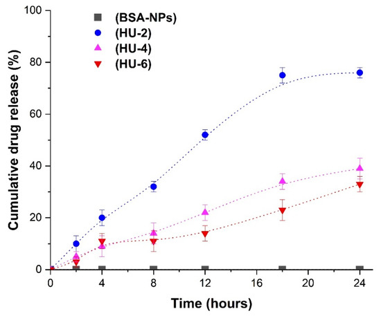 HU release profiles from BSA nanoparticles (BSA-HU-NPs) were analyzed for samples obtained by the inclusion method (Figure 8). The samples obtained at the initial concentration of HU 2; 4; 6 mg/mL were marked as HU-2, HU-4, HU-6, respectively. We obtained the yield for samples HU-2, HU-4 and HU-6 = 76 ± 5%, 38 ± 7% and 32 ± 5%, respectively; the drug was released during the 24 h from BSA–HU-NPs, which were prepared at concentrations of hydroxyurea 2, 4, and 6 mg/mL. It should be noted that the release of the HU was significantly slower after period of 24 h for each of the three samples. Approximately 50 ± 5% of hydroxyurea was released from the HU-2 sample within 12 h. Subsequently, the total yield of the drug was 76 ± 5% within a period of 24 h. Two samples with higher drug concentrations (HU-4 and HU-6) showed slow release, which is 38 ± 7% and 32 ± 5% HU within a period of 24 h, respectively. Thus, the data obtained by us can be compared with the results of a study on in vitro release of drugs using the same biologically active substances with human serum albumin nanoparticles [33]. This enables the continuous action on cancer cells, reaching a long-term effect on the viability of cells over time, in contrast to the full release of the drug during the period of 12 h.