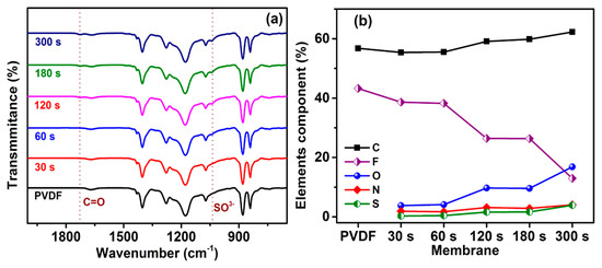 The PSBMA of UV treatment timing depends on the surface chemical composition, which was analyzed using ATIR-FTIR spectroscopy. The PVDF membrane surface functional group is compared with a PSBMA layer formation to confirm the new peak absorption in Figure 1a. The new absorption peak at 1726 cm−1 exists due to the C=O stretch vibration of PSBMA in the interaction with the membrane surface. The present peak at 1040 cm−1 can be attributed to the symmetric stretch vibrations of sulfonate (SO3−) groups [41,43]. Thus, FTIR results demonstrate the successful PVDF surface modification of zwitterionic copolymerization (PSBMA). To confirm the successful modification, XPS was used to provide a more detailed analysis.