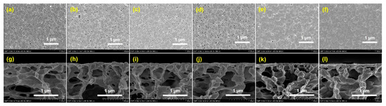 SEM images of surface and cross-section morphology for (a,g) PVDF, (b,h) PVDF-PSBMA30s, (c,i) PVDF-PSBMA60s, (d,j) PVDF-PSBM120s, (e,k) PVDF-PSBMA180s, and (f,l) PVDF-PSBMA300s.