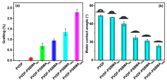where, W0 is the weight of unmodified membrane, and W1 is the weight after grafting the polymer chain [42]. Polymerization was observed in the membrane surface morphology (Figure 2a–f). Furthermore, the decreased water contact angles (WCA) show that the PVDF-PSBMA membranes’ surface hydrophilicity increases with a growth of PSBMA-grafted polymerization at the PVDF membrane surface. The lowest WCA value of the PVDF-PSBMA300s membrane surface was observed at 23°, which suggests an apparent growth in hydrophilicity when compared with the unmodified PVDF membrane. The WCA changed for grafting yields above 0.14% to 2.3%, which shows the grafting PSBMA polymerization on the PVDF membrane surface.