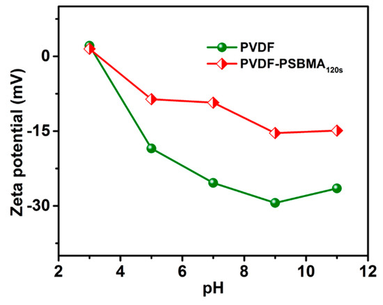 The zeta potential was measured for the membranes to study the effect of surface charge on the pH or electrolyte solution. Figure 4 shows how the unmodified PVDF and PVDF-PSBMA120s membrane surface charge changed at different pH solutions. The PVDF-PSBMA120s membrane showed a positive charge in the weaker base on a sulfonate group as opposed to an acid medium, and the negative charge shows the sulfonate and carboxylic functional group through the aqueous solution, while the zeta-potential performance was consistent for the modified membrane surface. The unmodified PVDF membrane and PVDF-PSBMA120s membrane exhibit a negative charge in the aqueous solution. The PSBMA120s membrane’s surface charge was observed to enhance hydrophilicity behavior on the SO3− foundation group present in the membrane. Therefore, the unmodified PVDF membrane and PSBMA120s membrane pore surfaces exhibit surface charge properties which enhance antifouling performance.