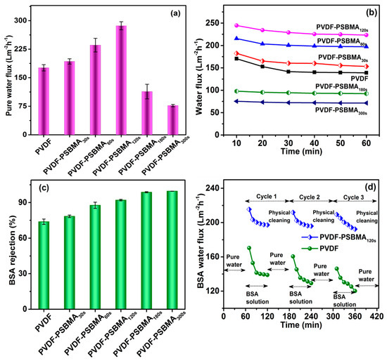 To investigate antifouling resistance performance of the unmodified PVDF and PSBMA-modified surface membrane, water flux studies were carried out using BSA as the model fouling solution. In Figure 5b, it can be seen that the unmodified PVDF membrane performance greatly decreased from 170.4 to 138.9 Lm−2h−1 of the BSA feed water flux up to 60 min, while BSA rejection performance was more stable at 73.79% ± 2.24% during the continued feed solution time of 60 min. The PSBMA120s modified membranes showed a significantly decreased BSA feed water flux value from 245 to 223 Lm−2h−1; this result was better than the PSBMA-modified membrane with a low or high duration of UV-light treatment, which had a weak pore stability, and the skin layer formed at the surface decreased the BSA feed water flux value. BSA rejection was slightly variable, with 78.3%, 87.6%, 98.7% and 99.6% for PSBMA30s, PSBMA60s, PSBMA180s and PSBMA300s, respectively. All surface-modified membranes showed better permeability and rejection compared with the unmodified PVDF membrane. Figure 5c shows that the BSA rejection reached 99.6% as the UV-light treatment time increased, but we consider that the high BSA feed water flux is optimized for further antifouling studies. Moreover, the remarkable increase in the permeability of the PSBMA membrane exhibits a uniform pore size and good hydrophilicity, which improves the zwitterionic membrane performance by a 2–3-fold increment compared with the previously reported PVDF-modified membranes [39].