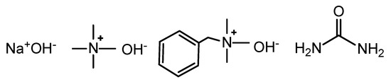 The structure of NaOH, tetramethylammonium hydroxide (TMAH), benzyltrimethylammonium hydroxide (Triton B), and urea.