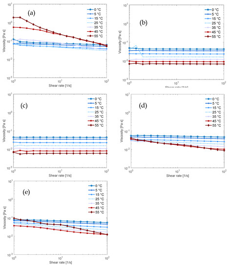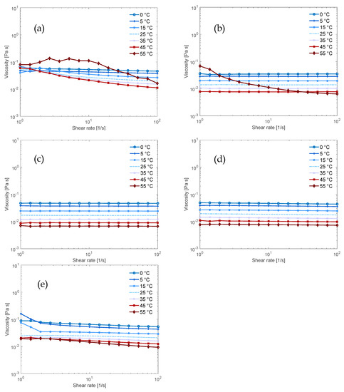 The results for the solutions that also contained urea confirm what was found for the dissolution capacity: the addition of urea enhanced the Newtonian behavior of the solutions containing NaOH and/or TMAH but did not have the same effect on the solutions containing Triton B (Figure 4a–c and also visible in the flow index in Tables S4 and S5 in the Supplementary Information). This is evident in the fact that the NaOH/TMAH/urea solution displayed Newtonian behavior over the entire temperature range (Figure 4d), thus urea improved the flow behavior while the NaOH/Triton B/urea solution had not improved as much (Figure 4e).
