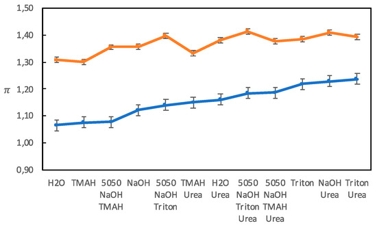 The π parameter measures the polarity and polarizability of a solvent, increasing with increasing polarizability and polarity with π = 0 for cyclohexane and π = 1 for dimethyl sulfoxide. According to the original method by Kamlet, Abboud, and Taft, at least seven different probes were used to measure π in order to minimize any specific interaction that could occur between a probe and a solvent. The average value of these seven π-values was then considered reliable enough to be used [21]. In most studies today, a single π-probe is used. We have used two different π probes, and as shown in Figure 5, the absolute values obtained differed, but the trends were, in general, the same.