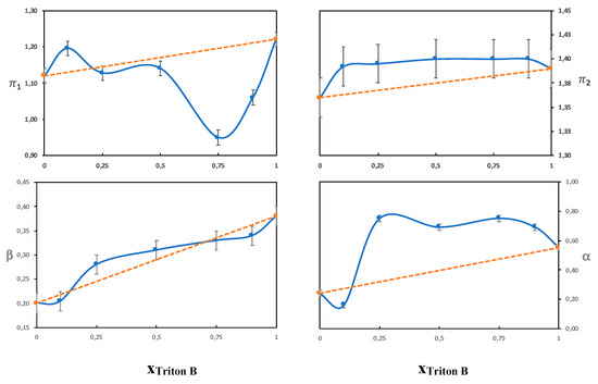The Kamlet-Taft parameters as a function of the molar fraction of Triton B in solutions of 4 mol% NaOH/Triton B.