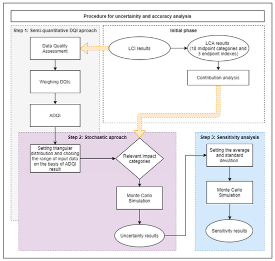 The steps of the procedure are closely related, in such a way that the results of the preceding step are input data for the following step. In this way, it is possible to determine the sensitive points of the LCA along with the determination of the relationships and dependencies of the input data uncertainty with the uncertainty of the results in terms of impact categories and damage areas.