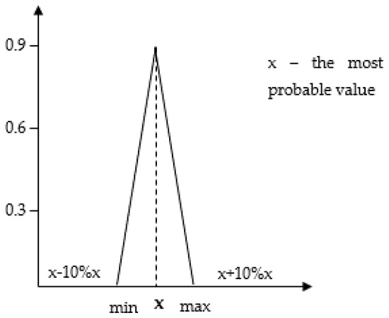 Attempts to link DQA results to the distribution of input data were made by Kennedy [17] and Wang [14] using the so-called transformation matrix. In this work, we combined the ADQI results with the levels of deviations of the process input values (Table 2) assuming a triangular distribution. Therefore, it was assumed that the data whose DQI score is 5 has a permissible standard deviation of ±10%. As can be seen, a deviation from the most probable value occurs only at the level of ±10%, which is manifested by a narrow triangular distribution (strong concentration around the central value) and high (high probability) triangular distribution shape. The idea of triangular distribution is explained in Figure 2. This means that a person who performs an LCA assumes that the value of a given inventory (Table 3) (e.g., energy consumption, water consumption, CO2 emissions) does not necessarily have to be x value (the result of a single measurement, estimation, collection from the company documentation, etc.), but that it can be a value from the range < x − 10% x; x + 10% x >.