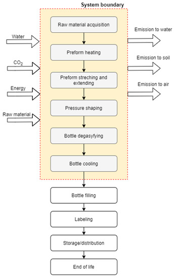 The analysis covers the entire cycle of the bottle shaping process, meaning that that all steps of this process are included, from the pre-mould delivery to the manufacturing company, up to the moment when beverage bottles are correctly shaped in the moulding process (Figure 3). Further processes, such as the filling of bottles with beverages, the labelling or storage/distribution thereof were not included in the system. Furthermore, the transportation of raw material and storage was also omitted.