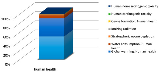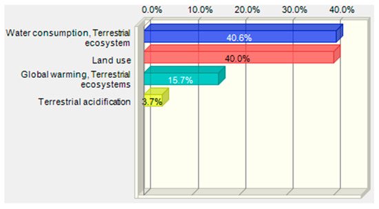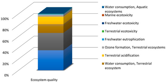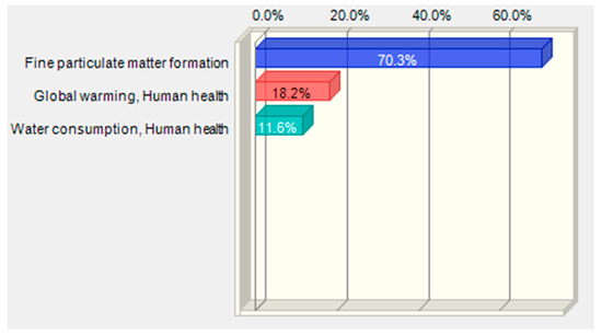 In the damage category, the impact of pre-form material—PLA in this case—prevailed (Figure 7). In the category of human health, the impact of pre-mould (76.86%) was followed by the pre-form heating phase (7.72%) and the stretching and extending stages (5.93%), while in the ecosystem quality category, the role of pre-form heating (5.81) and bottle cooling (4.79%) can be noticed.