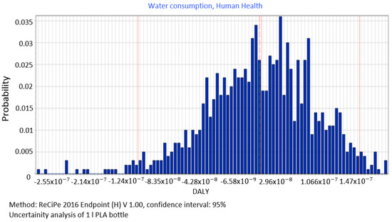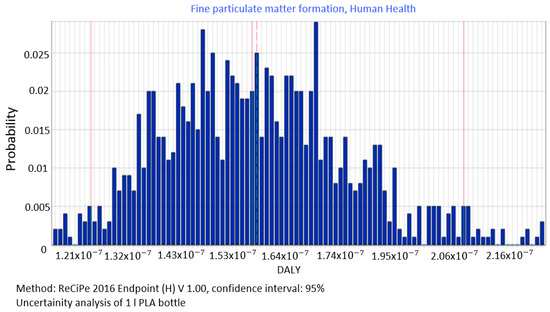 Before commencing the uncertainty analysis, it is necessary to obtain LCA results. This paper analyses the quality, uncertainty and sensitivity of data in the LCA of the PLA bottle moulding process. [55] presents a complete set of the system characterisation results. The uncertainty analyses were performed using relevant impact categories only (with the summarised share of 90% at least). In the human health area, relevant impact categories included (Figure 4): fine particulate matter formation (50.68%), global warming human health (39.82%), water consumption human health (8.64%). As regards the ecosystem quality area, these were (Figure 5): global warming terrestrial ecosystems (35.31%), land use (30.77%) and water consumption, terrestrial acidification (15.44%), terrestrial acidification (13.59%). For the resource availability (Figure 6), the fossil resources scarcity category was significant (99.23%). The pre-form material and the electric energy consumption in the bottle moulding process were the most important determinants of the above-listed categories value.