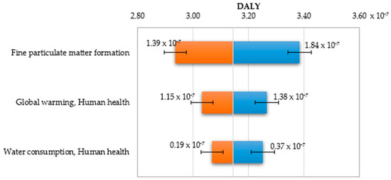 Figure 17. Tornado chart for the forecast of significant categories of impact on human health— error bars show the mean standard error value.
