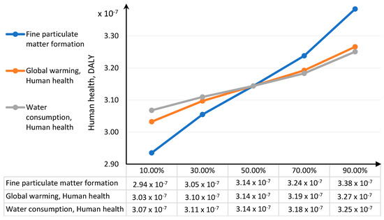 The approach to stochastic modeling using MC simulation is a common method of quantitative uncertainty analysis in LCA. In this work, we used the MC simulation, because it allows one to quickly estimate the probability of results depending on the variability of input data, and thus identify the results with the highest sensitivity and uncertainty. The first assessment step is to correctly define the input parameters necessary to conduct the analysis properly. Triangular distributions based on two values—maximum and minimum—were used to estimate the impact category uncertainty. At this stage, the influence of the input parameters on the significant impact categories (impact categories which in total constituted 90% of damage area were considered as significant) was estimated. According to the adopted procedure, the values of the input parameter deviations depend on the ADQI result according to Table 2. For each input parameter, a value within the range of data variability was artificially generated and then values of selected impact categories were calculated. The procedure was repeated 1000 times to obtain the uncertainty distribution. This simulation was carried out using Sima Pro software.
