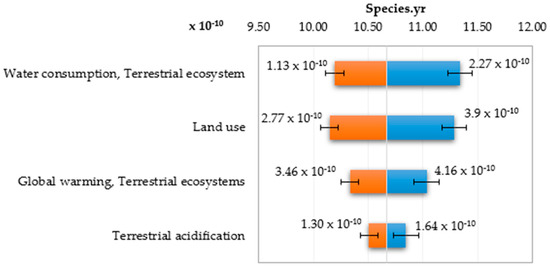 Figure 20. Tornado chart for the forecast of significant categories of impact on ecosystems—error bars show the mean standard error value.