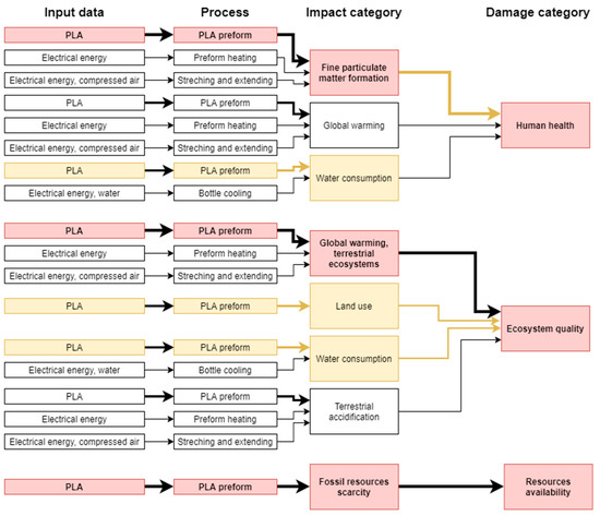 Figure 22. Paths of key links between input data and impact and damage categories. The figure presents input data for only significant stages of the PLA bottle shaping process and relevant impact categories. Bold arrows represent inputs with the greatest share in the process or category. Chains marked in red are those with the greatest share in the damage category, while yellow chains bring the greatest uncertainty with respect to the final result of the impact and damage category.
