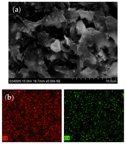 The SEM image of the graphene-loaded coating. (a) The micrograph of cross-section; (b) EDS images of carbon and oxygen.