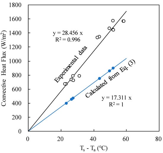 The ANOVA results indicated that qT was the minor factor for hc. This is supported in Figure 8 that higher qT led to slightly higher hc. In forced convection, according to Equation (3), the convective heat transfer coefficient is proportional to the thermal conductivity of the air, which increases with the temperature. Because the surface temperature increased with the total heat flux, leading to higher thermal conductivity and hence higher hc. However, the increase in hc was small, thus the slope of qc in Figure 5 was a constant, suggesting a constant hc.