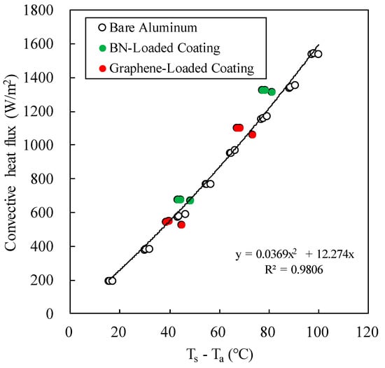 Table 12 shows the ANOVA results and that for hr, the major factor is the surface coating and the minor factor is the type of convection. The total heat flux affected the least the radiative heat transfer. The radiative heat transfer increased with the emissivity of the surface. In this study, the emissivity varied greatly, ranging from 0.07 for aluminum, 0.4 for BN-loaded coating, to 0.88 for graphene-loaded coating. Thus, the effect of emissivity on hr is significant. Figure 9 also shows this effect. The type of convection affected hr through Ts and Ta, because hr can be calculated as follows:
