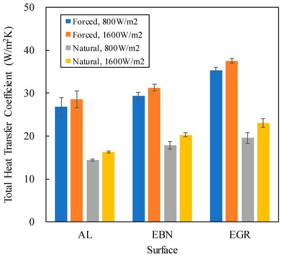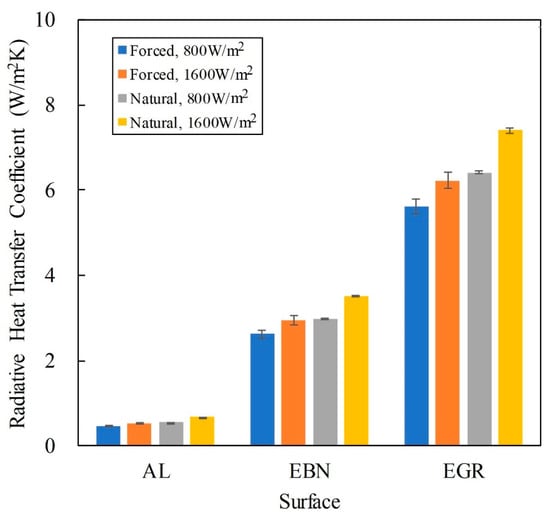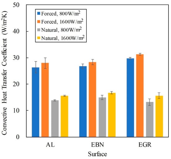 Figure 7 shows that the total heat transfer coefficient of the forced convection was about twice of that of the natural convection. This reflects the fact that forced convection can remove heat faster than natural convection. Furthermore, bare aluminum surface exhibited lower hT and hr than the other two coated surfaces. This can be attributed to the faster radiative heat transfer from coated aluminum plates, and that graphene-loaded coating exhibited higher hT than other surfaces, since the emissivity of EGR was much higher than others. Figure 7 also shows that higher total heat flux (qT) led to higher hT for each surface. In forced convection, the increase was at most 6%, whereas in natural convection, the increase jumped to 17%. However, the effect of qT was less than the effect of the surface, which is consistent with ANOVA.