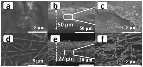 Scanning electron micrographs of the prepared PLS/SiO2 particles and PLS/3D SiO2 NFs are shown in Figure 1 and Figure S1. An agglomeration of SiO2 nanoparticles in the PLS can be seen in Figure 1a–c. Due to the uneven distribution of mechanical stress and electric field, inevitable clustering damaged the performance of the electrolyte []. On the contrary, SiO2 NFs were evenly distributed in the main body of the PLS (Figure 1d–e), which can be attributed to the rigid structure of 3D SiO2 NFs. It should be noted that the minimum thickness of freestanding PLS/SiO2 particle membrane prepared by the flow coating method is 50 μm []. In contrast, in the case of 3D SiO2 NFs, the thickness of PLS/3D SiO2 NFs can be controlled below 27 μm. The application of thinner SPEs in SLBs is vital to achieve improved energy density.
