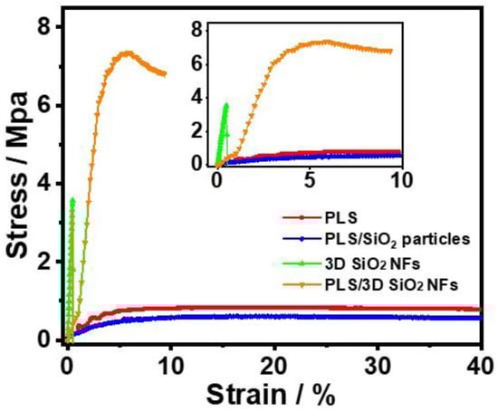 The stress–strain curves of the 3D SiO2 NFs and SPEs are illustrated in Figure 2. A mechanical strength of 0.6 MPa was observed in the PLS. The poor mechanical performance is one of the most critical obstacles for the practical application of PEO-based SPEs, such as PLS. Under the framework of 3D SiO2 NFs with a mechanical strength of 3.7 MPa, the maximum stress of PLS/3D SiO2 NFs reached 7.4 MPa. PLS/3D SiO2 NFs with enhanced mechanical properties are favorable for safety and show great potential in meeting the requirements of battery assembly. However, compared to the original PLS, the mechanical strength of PLS/SiO2 particles was even lower (0.4 MPa). The PLS/SiO2 particles were prone to break at the point of absence of PEO matrix due to the agglomeration of SiO2 particles (Figure 1c).