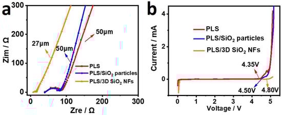(a) AC impedance curves of PLS, PLS/SiO2 particles, and PLS/3D SiO2 NFs. (b) Linear sweep voltammetry (LSV) profiles of PLS, PLS/SiO2 particles, and PLS/3D SiO2 NFs with a range of 0–6 V at 0.5 mV s−1.
