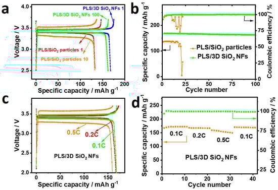 Charge and discharge curves (a) and cycling performance (b) of Li | PLS/SiO2 particles | LiFePO4 (LFP) and Li | PLS/3D SiO2 NFs | LFP. Charge and discharge curves (c) and rate performance (d) of Li | PLS/3D SiO2 NFs | LFP.