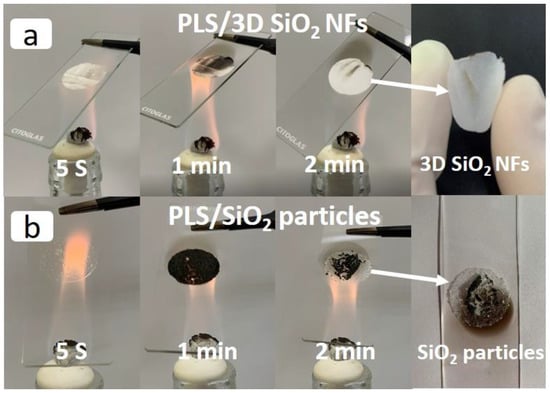 Digital images of PLS/3D SiO2 NFs (a) and PLS/SiO2 particles (b) heated with an alcohol lamp.