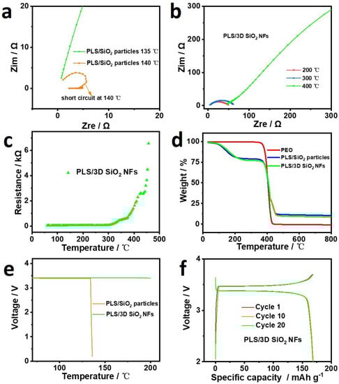 (a) AC impedance curves of PLS/SiO2 particles at 135 and 140 °C. AC impedance curves (b) and resistance (c) of PLS/3D SiO2 NFs at 200–400 °C. (d) TGA profiles of PEO, PLS/SiO2 particles, and PLS/3D SiO2 NFs with a heating rate of 10 °C min−1. (e) Open circuit voltage (OCV) of Li | PLS/SiO2 particles | LFP and Li | PLS/3D SiO2 NFs | LFP pouch cells as a function of temperature at 60–200 °C. (f) Charge and discharge curves of Li | PLS/3D SiO2 NFs | LFP pouch cells after OCV treatment.