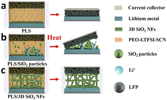 The above improvement of battery performance with the aid of PLS/3D SiO2 NFs can be explained by Figure 8. As shown in Figure 8a,b, the shrinkage or decomposition of PLS will destroy the structure of the PLS and PLS/SiO2 particles, which will lead to the contact of electrodes, further causing the short circuit of batteries. However, the ceramic framework of PLS/3D SiO2 NFs can prevent the contact of anodes and cathodes when PLS is decomposed, thus ensuring the safety of batteries. Besides, with the aid of SiO2 particulate fillers, the gathering of ceramic fillers leads to uneven mechanical stress and electric field distribution of PLS/SiO2 particles. The aggregated areas of PLS/SiO2 particles are the mechanical weak points as well as concentrated areas for lithium-ion plating/stripping. Therefore, lithium dendrites can easily form and pierce those weak points (Figure 8b). Meanwhile the uniform ceramic framework of the PLS/3D SiO2 NFs is beneficial to the even transport of lithium ions, which can effectively inhibit the growth of lithium dendrites (Figure 8c).