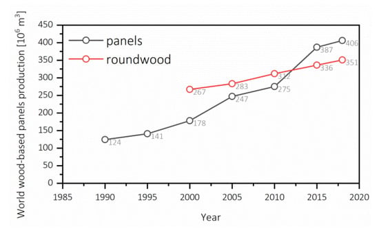 Global development and population growth [] result in a more significant demand for new space for accommodation. Due to that fact, there is also a growing need for building materials, not only bricks or plasterboards, but also wood-based panels, for example, oriented strand boards (OSB), plywood, or insulation boards, including soft boards (SB) or low-density fiberboards (LDF). Together with the operation new residential buildings, the demand for new furniture made of, for example, particleboards (PB) or fiberboards, among which the most common are hardboard (HB), medium-density fiberboards (MDF), and high-density fiberboards (HDF), is growing as well. For this reason, there has been a considerable growth in the world production of wood-based panels. Figure 1 presents how the world production of wood-based panels has increased from 124 million m3 in 1990 to over 405 million m3 2018 [].