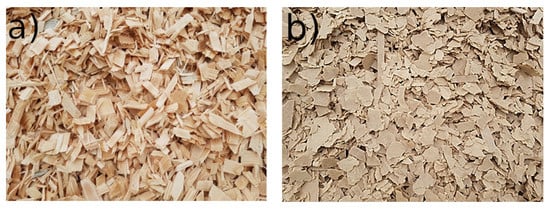 Figure 2 presents a visual assessment of virgin pine chips and shredded HDF particles. The first visible difference is the color, with HDF-r being darker than wood chips. These color differences might be caused by the hydrothermal treatment during the defibrating process, but also by the caramelization of simple sugars (pentoses and hexoses) during pressing operation [].