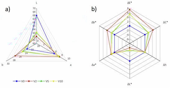 HDF color analysis: L, a and b parameters (a) and E, C, h, L, a and b changes (Δ) (b).