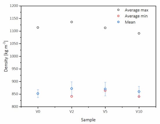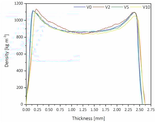All the examined density profiles were similar and characteristic for HDF panels; moreover, from these figures, it can be observed that there was no delamination of the HDF. Figure 5 shows the average maximum surface density (ASD) and the average minimum core density (ACD). The highest ASD was obtained for V2 (1136 kg m−3), while the lowest ACD was obtained for V10 and V2, being 840 and 841 kg m−3 accordingly. The biggest difference between ASD and ACD was observed for V2. Additionally, similar to the lowest ACD, the minimum ASD was obtained for V10 (1091 kg m−3), which is 4% less than the maximum. The difference between ASD and ACD for V0 was 262 kg m−3, while for V5, it was 5% lower and gave the smallest difference in density profile (249 kg m−3). The ASD of V5 was comparable to that of V0 and was on the level of 1114 kg m−3. It is worth noticing that not only the surface and core densities influence the properties of fiberboards properties, but also the difference between those two parameters [].