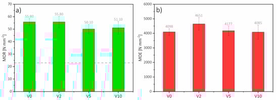 Bending strength results are shown in Figure 6. V0 had a modulus of rupture (MOR) of 55.8 N mm−2 with a density of 852 kg m−3, which is within EN 622-5 requirements (grey line level on Figure 6) of the average density tolerance of 860 kg m-3 +/−7% []. Panel properties such as MOE and MOR are positively affected by an increase in density []. However, having higher moisture content affects those properties negatively []. Although V2 had MOR comparable to V0 (55.8 N mm−2), its density (872 kg m−3) was 20 kg m−3 higher, this might have influenced the final MOR result. In particular, the highest surface density (1136 kg m−3) might have affected. Additionally, the moisture content of V2 (5.29%) was more than six percentage points higher than V0 (5.63%), which, according to Ganev et al. [], might have also influenced the result.