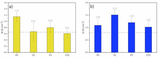 Results for the internal bond (IB) of the HDF are presented in Figure 7. As it can be seen, not all the panels met the requirements for HDF stated at EN 622-5 (grey line level on Figure 7a), which demands IB to be above 0.65 N mm−2. While V0 had an IB of 1.15 N mm−2, the mean IB of panels with HDF-r was significantly lower. The lowest IB was obtained for V10 (0.61 N mm−2), and it was nearly 50% lower compared to V0, and ≈25% lower than V5 (0.80 N mm−2). Based on fiber bulk density and fiber analysis (Table 2 and Table 3), such fibers may have a smaller particle size compared to HDF fibers from V0. The larger amount of fines increases the surface area of the fibers, which results in decreasing the resin coverage per unit surface area []. Hence, the strength of the final panel is lower. V2 obtained 15% lower IB (0.67 N mm−2) compared to V5, this might be caused by a difference in the density distribution on the profile. In V2, the average difference between ASD and ACD on the density profile was about 295 kg m−3, while in V5, it was: 249 kg m−3.