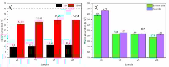 The thickness swelling (TS) after 2 and 24 h values of HDF panels are displayed in Figure 8. The results for V0, V2, and V5 showed that TS2 and TS24 were dependent on the share of HDF-r, having a positive linear correlation. Wood, but also all wood-based products, shrink or swell depending on the moisture content of the material []. The relationships between shrinkage, swelling, and moisture content are roughly proportional [], and there have been several reviews in the literature confirming that swelling of wood-based panels is decreasing with an increase of the moisture content []. For this reason, the minimum TS2 and TS24 could be noticed for V0, being 9.90% and 31.03%, accordingly, while the moisture content of V0 was 5.63%, which was the highest observed. The TS24 of V2 (32.82%) increased ≈5% compared to V0, while V5 had an increase of ≈5% to 34.25%. An increase in TS of panels with HDF-r might be caused by their rougher structure and their smaller dimensions compared to virgin fibers [,]. The highest TS2 and TS24 were measured for V10, being 11.71% and 34.54%, respectively, which was ≈15% and ≈10% higher than V0. As can be seen, all the panels met the requirements for HDF stated at EN 622-5 (grey line level on Figure 8a). The only statistically significant differences between the achieved mean values of thickness swelling, both TS2 and TS24, have been confirmed between V0 and V10 (Table 4).