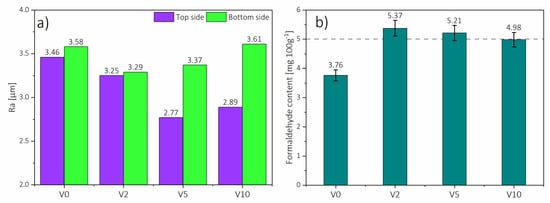 As it was mentioned, the panels were produced in compliance with CARB 2 standard. Therefore, the required formaldehyde content should be below 5.0 mg 100 g−1 (grey line level on Figure 9b). In this sense, not all the boards met that requirement being V2 and V5 out of the CARB 2 specifications. As can be seen in Figure 9b, V0 had the lowest formaldehyde content (3.76 mg 100 g−1), while the highest was obtained for V2 (5.37 mg 100 g−1), which is ≈43% more. Further addition of HDF-r caused a decrease in formaldehyde content in V5 to 5.21 mg 100 g−1 but still out of specification. However, V10 had the lowest result of formaldehyde content (4.98 mg 100 g−1) from all the tested boards produced with HDF-r, which allowed meeting CARB 2 requirements. This decrease of formaldehyde content with an increase in the recycled share of fibers was also observed for MDF [].