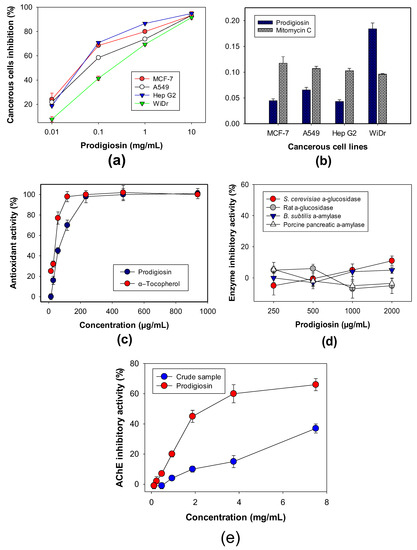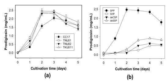 Chitin and protein-containing marine by-products (CPCMBPs), such as squid pens, shrimp and crab shells, are obtained abundantly from the fishery processing industry [1,2,3,4,5,6]. CPCMBPs have high chitin content and were therefore utilized earlier for the production of chitin. CPCMBPs also contain a high amount of protein and mineral salts, thus, strong inorganic acid and alkali are used for demineralization and deproteinization of CPCMBPs to produce chitin, causing pollution due to acid or alkali liquid [4,7]. Bioprocessing, being environmentally-friendly, was established for conversion of CPCMBPs into chitin [8], and several other bioactive products were applied for nutritional, biotechnological, agricultural, biomedical, and pharmaceutical purposes [8,9,10,11,12,13,14,15]. Recently, CPCMBPs were explored for the production of antioxidant and anti-NO compound homogentisic acid [16,17] and extensively investigated for the biosynthesis of targets of enzyme inhibitors in antidiabetic drugs [1,16,18,19]. In this study, CPCMBPs were used for the cost effective production of bioactive prodigiosin (PG) at a high level via microbial fermentation.