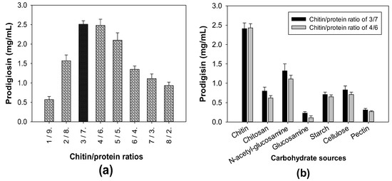 The influence of chitin/protein ratio (a) and various carbon sources (b) on PG biosynthesis by S. marcescens TNU01. A carbohydrate/protein ratio of 3/7 or 4/6 was used for fermentation.
