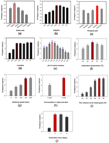 The effect of sulfate salts (a), added MgSO4 (b), phosphate salts (c), and added K2HPO4 (d), initial pH of the medium (e), cultivation temperature (f), shaking speed (g), fermentation in light (no cover the flask) or in dark (cover the flask) (h), the volume of air headspace percentage (i), and cultivation time (j) on PG production by S. marcescens TNU01.